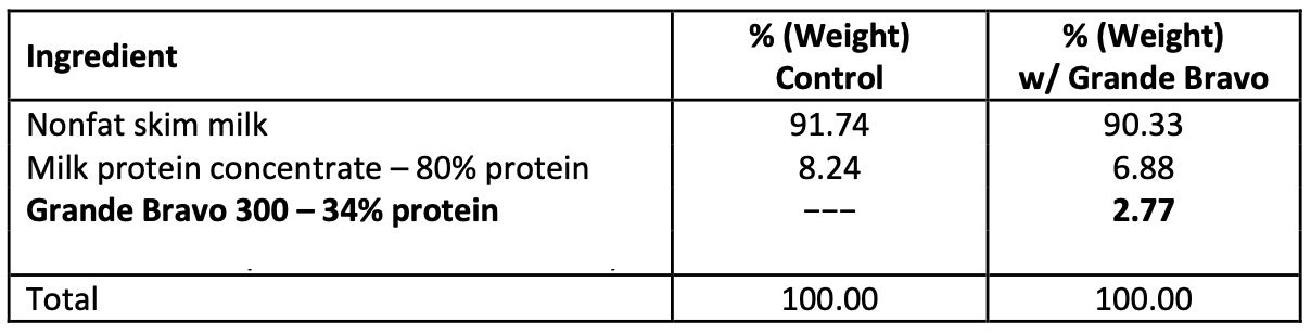 Using a rheometer to determine viscosity, the reformulated system with Grande Bravo reduced viscosity compared to the control, demonstrating significant transformation of the casein-driven gel structure.
