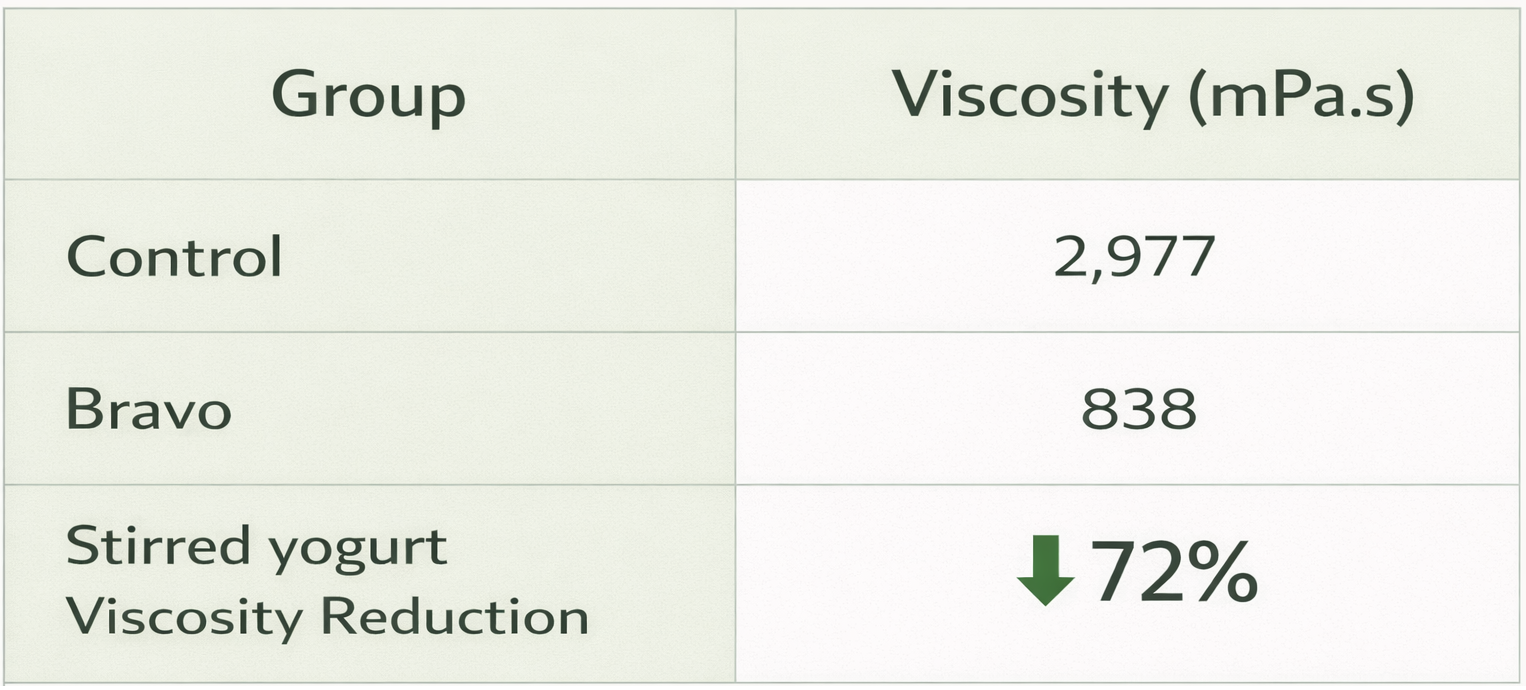 Lower-viscosity systems improve pumpability through pipelines and heat exchangers, reduce mechanical stress during mixing and filling, and require less mechanical input to achieve a smooth, homogeneous texture during processing and post-fermentation handling. From an operational standpoint, this can translate to lower energy input, more consistent batch processing, and improved throughput and process reliability.